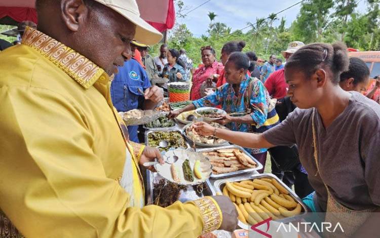Masyarakat saat mengambil makanan lokal Papua yang dapat mencegah stunting. (ANTARA/Qadri Pratiwi)