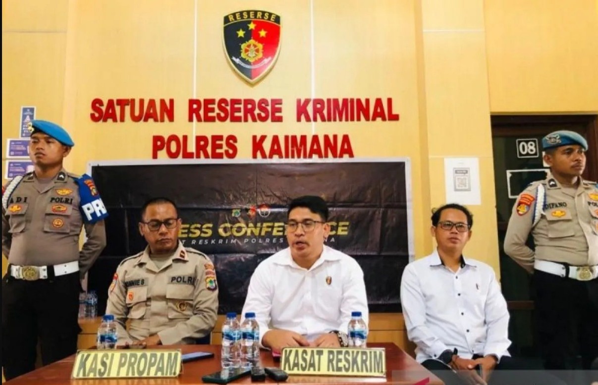 Kepolisian Resor Kaimana menggelar konferensi pers terkait kasus rudapaksa dua anak di bawah umur yang melibatkan oknum anggota di Kaimana, Papua Barat, Senin. (ANTARA/HO-Isabella Wisang)