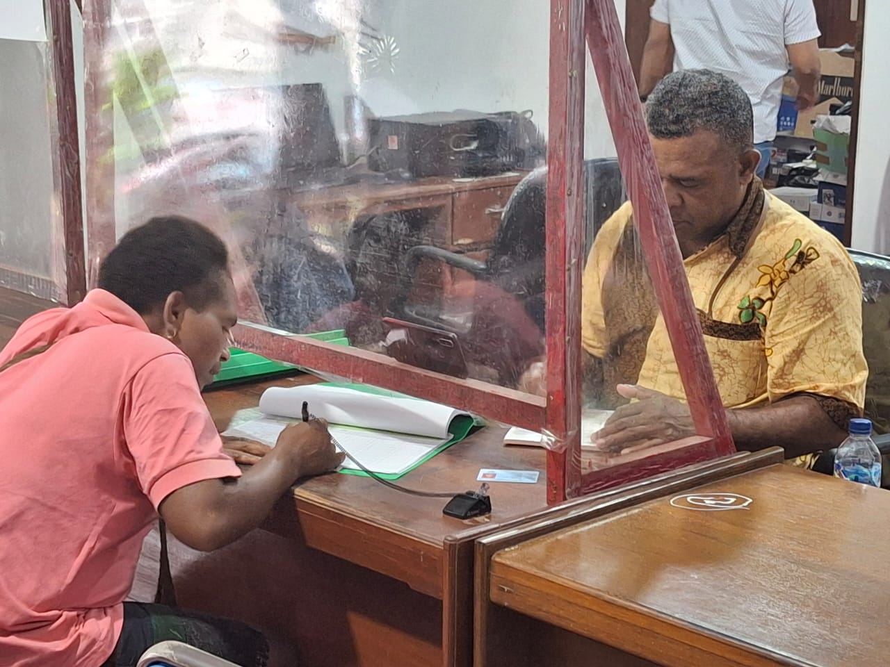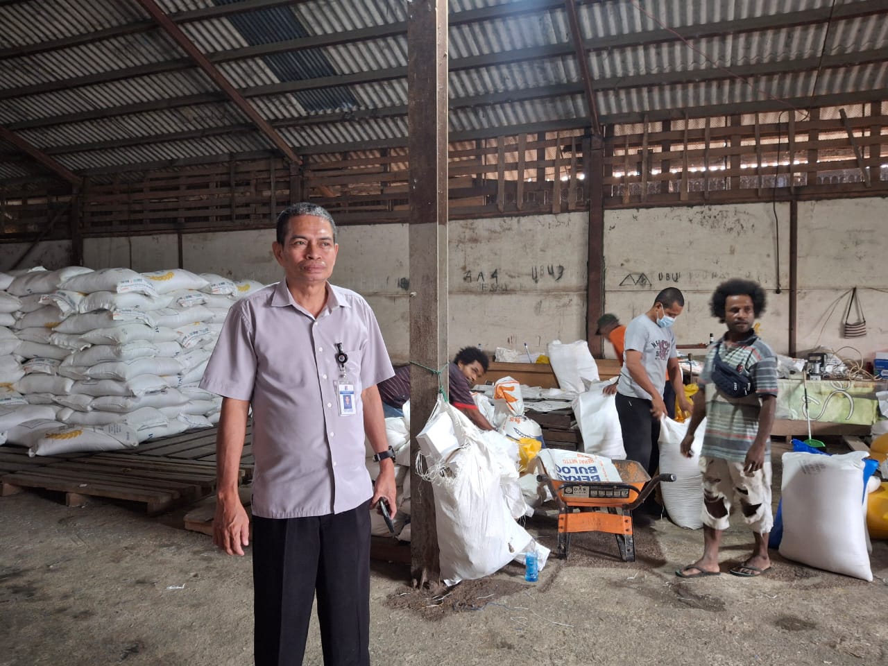 Pegawai PT Irian Bhakti Papua sedang melayani seorang pegawai yang hendak mengambil jatah beras dari gudang di kompleks Pelabuhan Manokwari, Rabu (26/3/2025). (Papuabaratnews,id/Sam Sirken)