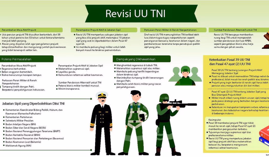 Revisi UU TNI ini menyangkut tiga klaster yang dibahas yaitu Kementerian Pertahanan yang menangani pengadaan, rekrutmen dan pemeliharaan alat utama sistem persenjataan (alutsista); penambahan lembaga sipil yang bisa diduduki TNI, dan penambahan usia pensiun. Beberapa aspek penting militer, seperti profesionalisme, kesiapan operasi, pemikiran strategis, dan pentingnya menanggapi perkembangan strategis yang berubah cepat, tidak terlihat.