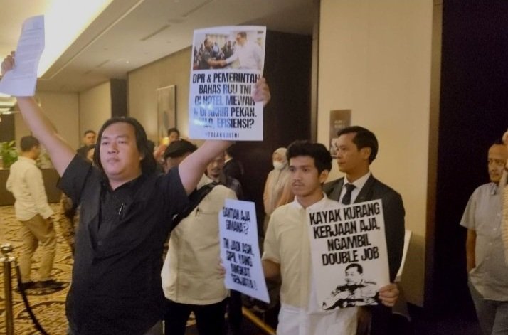 Mereka juga sempat meneriakkan kata-kata tolak revisi UU TNI dan meminta TNI agar kembali ke barak. Setelah keluar dari ruang rapat, mereka masih sempat melanjutkan berorasi. Namun, tak lama mereka keluar dari hotel.