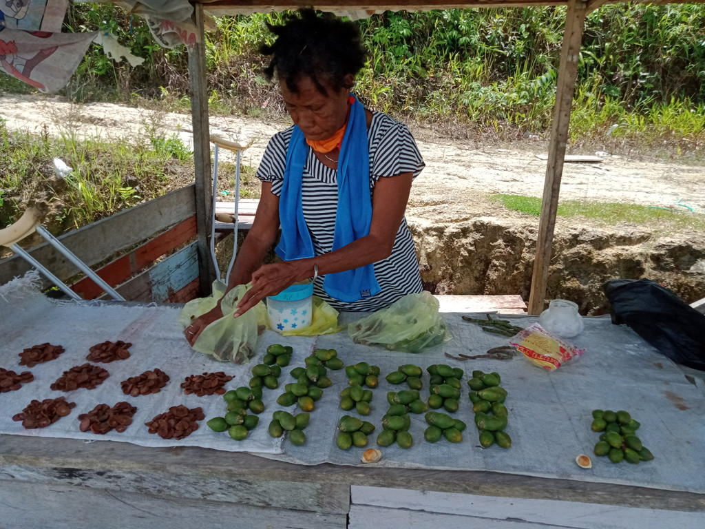 Mama Papua sedang menjual pinang di pondok yang berada di pinggir jalan raya. Penjual pinang merupakan pekerja informal yang seringkali bekerja di lingkungan tidak aman, berisiko tinggi, berpenghasilan rendah. Sehingga tidak mampu membayar iuran jaminan sosial Ketenagakerjaan secara mandiri dan berkelanjutan. (Papuabaratnews.id/Istimewa)