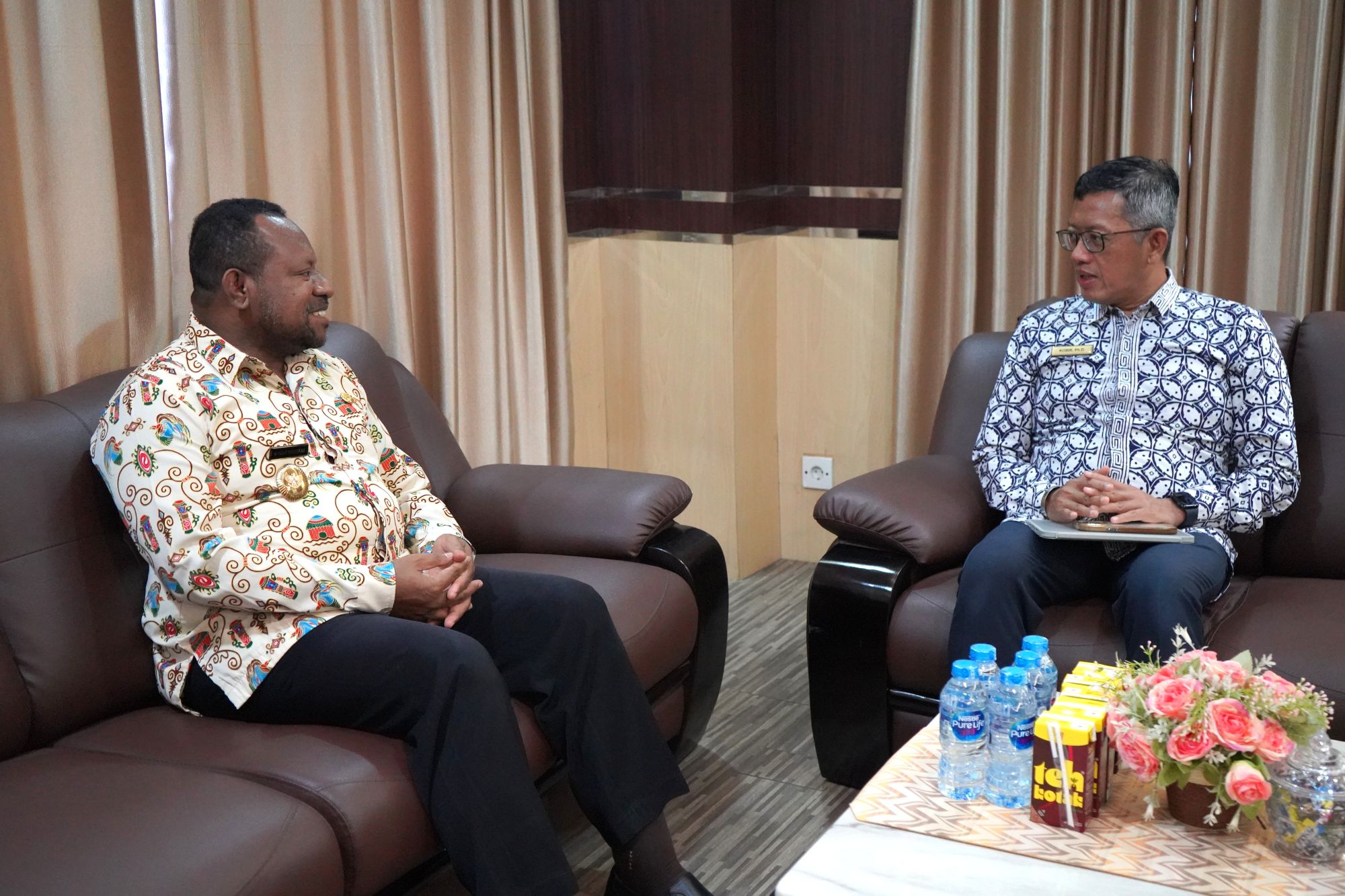 Wakil Gubernur Papua Barat Daya, Ahmad Nausrau (kiri), menerima kunjungan Kepala Kanwil DJPb Papua Barat, Moch. Abdul Kobir (kanan), guna membahas sinergi dalam optimalisasi belanja dan penguatan tata kelola keuangan daerah, Kamis (31/7/2025). (Dok DJPb PB)