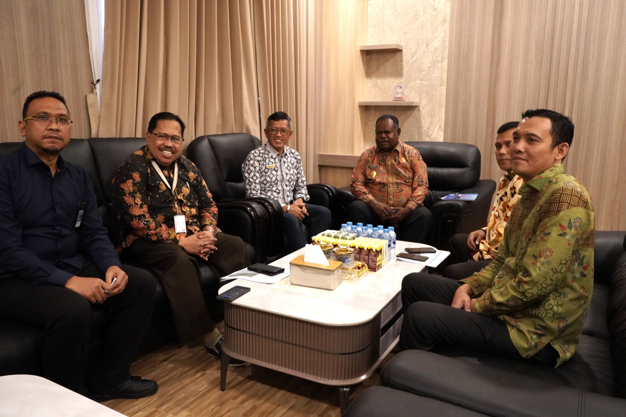 Kepala Kanwil DJPb Papua Barat, Moch. Abdul Kobir (tengah kiri), Anggota BP3OKP Papua Barat Daya, Otto Ihalauw (dua dari kiri), bersama Gubernur Papua Barat Daya, Elisa Kambu (tengah kanan), dan jajaran pejabat lainnya dalam pertemuan strategis membahas penguatan sinergi pengelolaan keuangan negara di Provinsi Papua Barat Daya di Kantor Gubernur Papua Barat Daya, Sorong, Kamis (31/7/2025). (Dok DJPb PB)