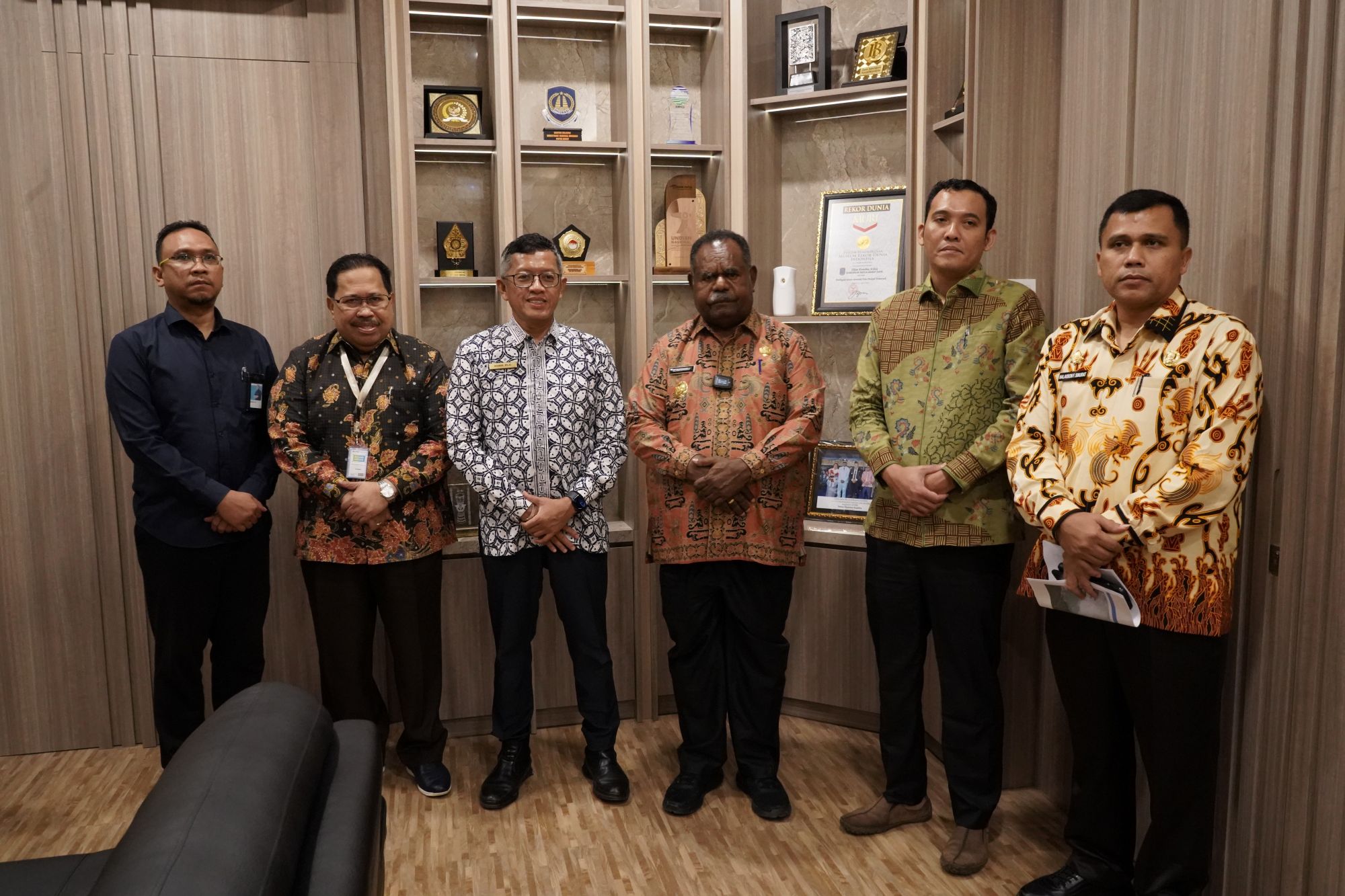 Kepala Kanwil DJPb Papua Barat, Moch. Abdul Kobir (tengah kiri), foto bersama Anggota BP3OKP Papua Barat Daya, Otto Ihalauw (dua dari kiri), dan Gubernur Papua Barat Daya, Elisa Kambu (tengah kanan), usai pertemuan strategis membahas penguatan sinergi pengelolaan keuangan negara di Provinsi Papua Barat Daya di Kantor Gubernur Papua Barat Daya, Sorong, Kamis (31/7/2025). (Dok DJPb PB)