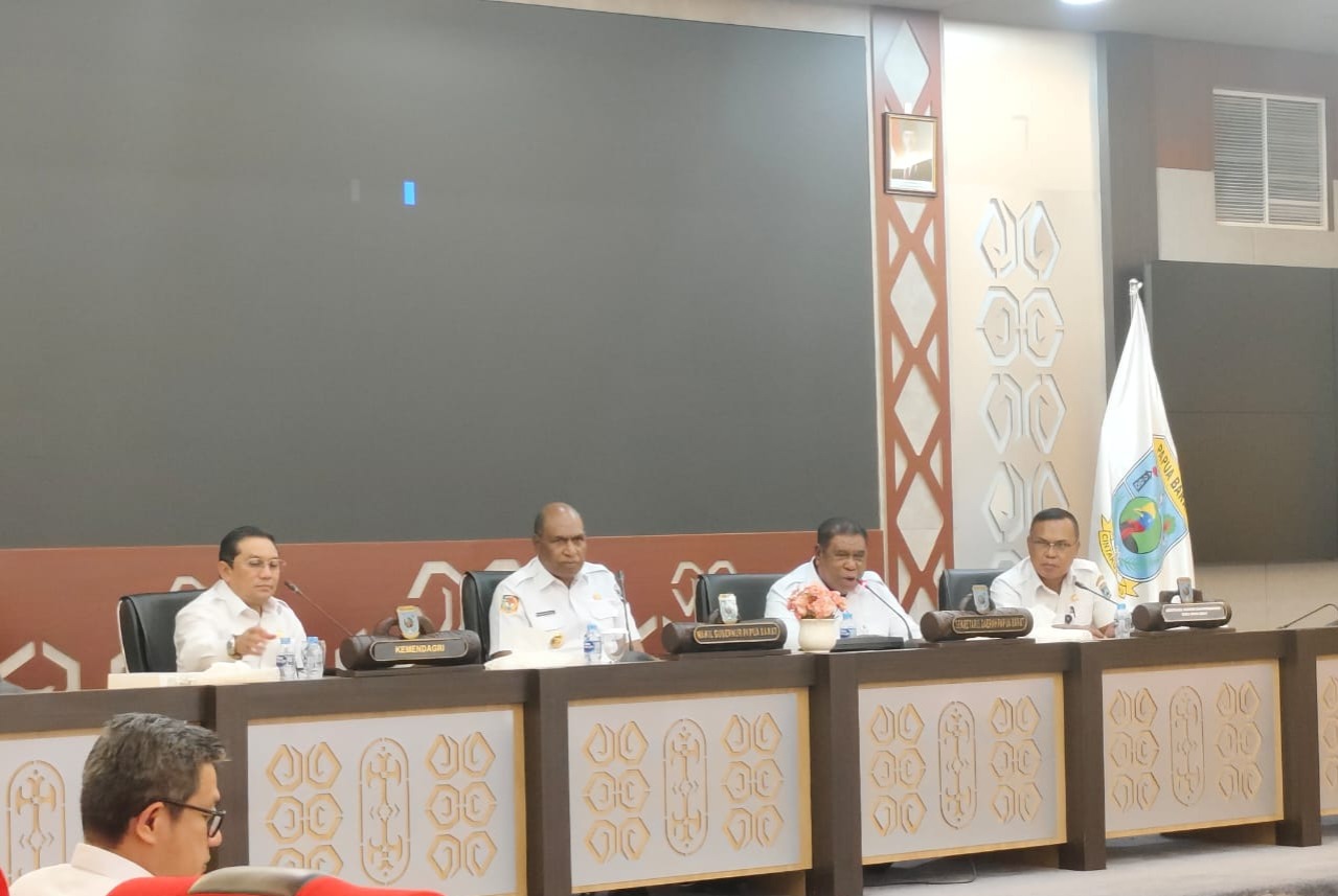 Direktur BUMD, BLUD, dan BMD Ditjen Bina Keuangan Daerah Kemendagri Yudia Ramli bersama Sekda Papua Barat Ali Baham Temongmere memimpin rapat monitoring dan evaluasi serapan APBD 2025 di Manokwari, Rabu (26/11/2025). (Dok. Istimewa)