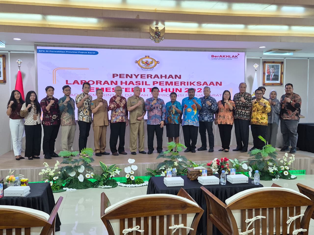 Jajaran BPK Papua Barat dan pemerintah daerah berfoto bersama usai penyerahan LHP kinerja pelayanan JKN di Teluk Wondama dan manajemen aset daerah Kabupaten Kaimana. (Dok. Istimewa)
