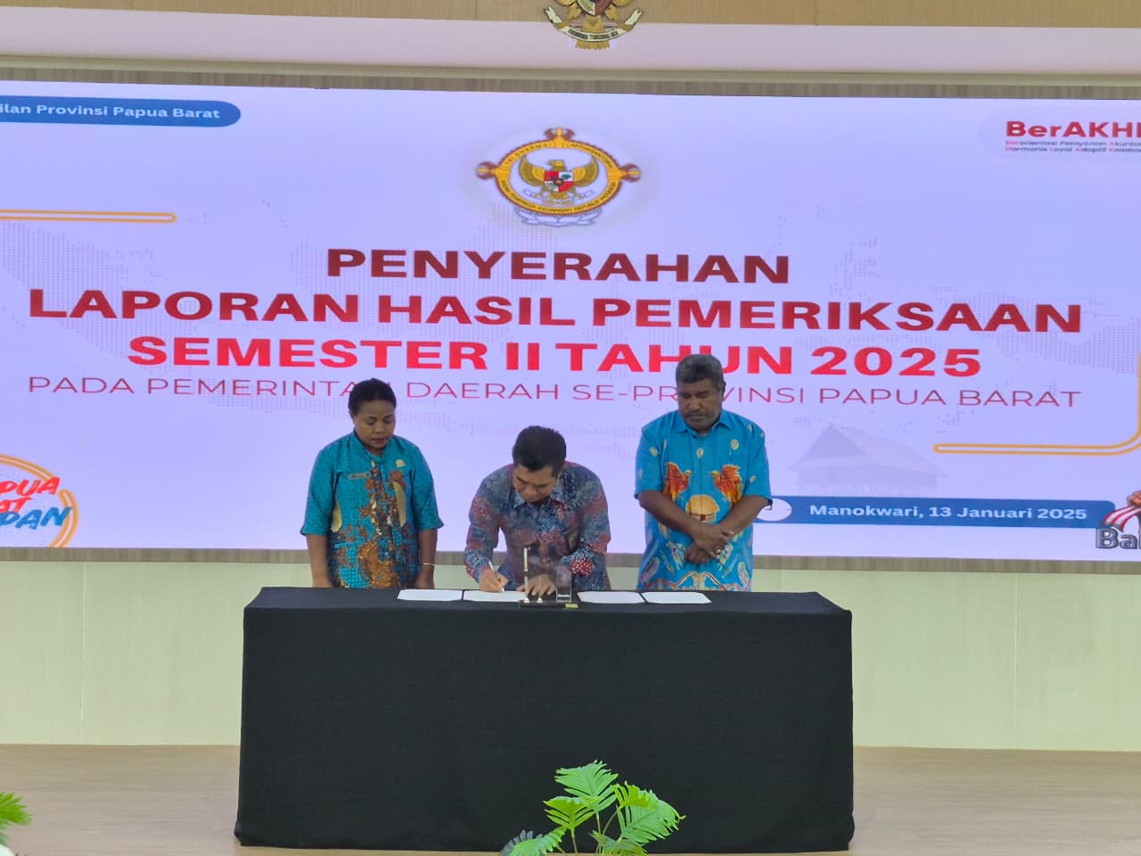 Penandatanganan berita acara penyerahan Laporan Hasil Pemeriksaan (LHP) kinerja oleh BPK Perwakilan Provinsi Papua Barat kepada perwakilan pemerintah daerah di Manokwari, Senin (13/1/2026). (Dok. Istimewa)