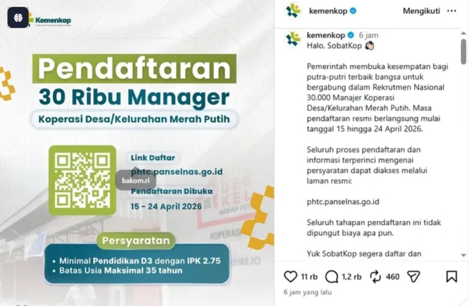 Papuabaratnews.id, Jakarta –- Pemerintah membuka rekrutmen tahap pertama untuk posisi 30 ribu manajer Koperasi Merah Putih. Pembukaan lowongan kerja melalui panitia seleksi nasional itu resmi diumumkan oleh Menteri Koordinator Bidang Pangan sekaligus Ketua Satuan Tugas Pembentukan Koperasi Desa (Kopdes) Merah Putih Zulkifli Hasan dalam jumpa pers di Jakarta, Rabu (15/4/2026).